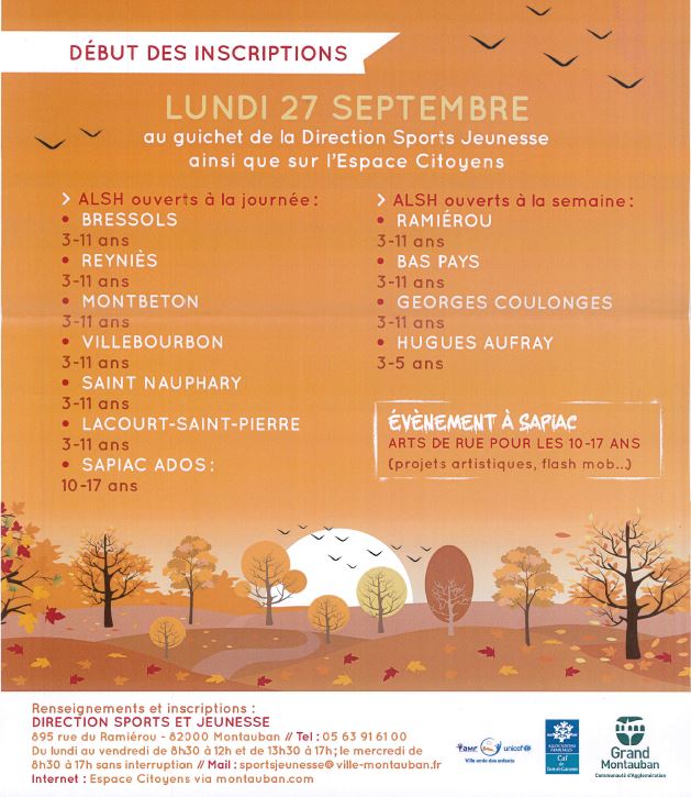 Accueil téléphonique 05 63 91 61 00 ou mail sportsjeunesse@ville-montauban.fr