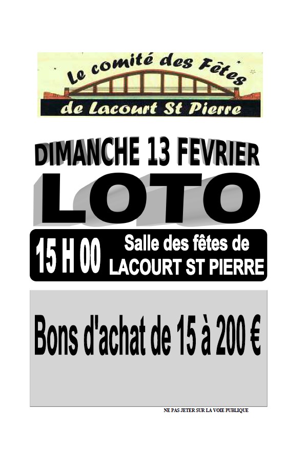 Le Comité des fêtes de Lacourt St Pierre organise un loto à la salle des fêtes à 15H00.